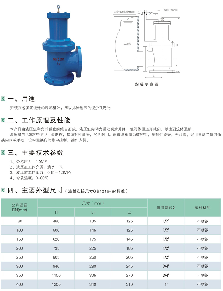 液壓、氣動(dòng)角式快開排泥閥,是一種由液壓源或氣動(dòng)源作執(zhí)行機(jī)構(gòu)的角型截止類閥門。通常成排安裝在沉淀池底部外側(cè)壁,用以排除池底沉淀的泥砂和污物。該閥液壓缸之活塞為L(zhǎng)形皮碗,密封性能好,經(jīng)久耐用,閥門密封副亦為橡膠密封,無泄漏。還可通過電動(dòng)二位四通換向電磁閥實(shí)現(xiàn)遠(yuǎn)程控制。操作方便,安全可靠。液壓角式快開排泥閥,氣動(dòng)角式快開排泥閥,角式快開排泥閥。